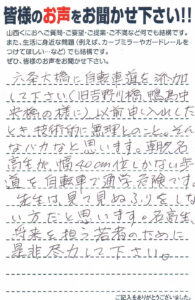 私のほうにもたくさんの方々から六条大橋歩道拡幅についてご要望を頂いてまいりました。県に対して何度も要望を重ね今年度(令和2年度)拡幅に向け設計に着手することとなりました。早期実現に向け継続的な予算確保に努めて参ります。ご意見をありがとうございました。(2020.5)